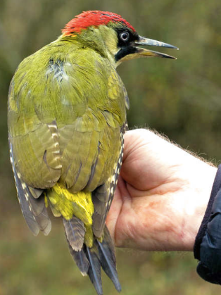 Left:green woodpecker being held.
